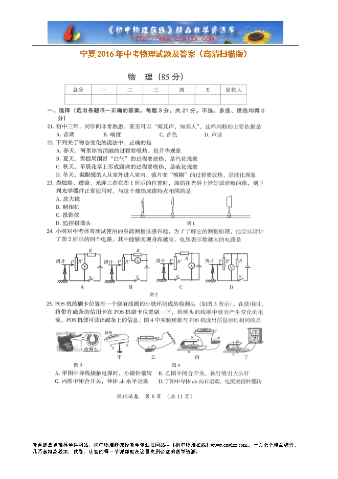 【内容简介】宁夏2016年中考物理试题及答案(高清扫描版)