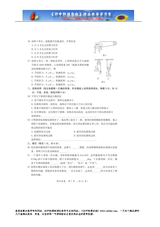 宁夏2016年中考物理试题及答案(高清扫描版)
