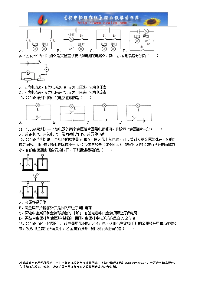 2016年全国各地中考物理试题分类解析汇编(第二辑):第15章 电流和电路