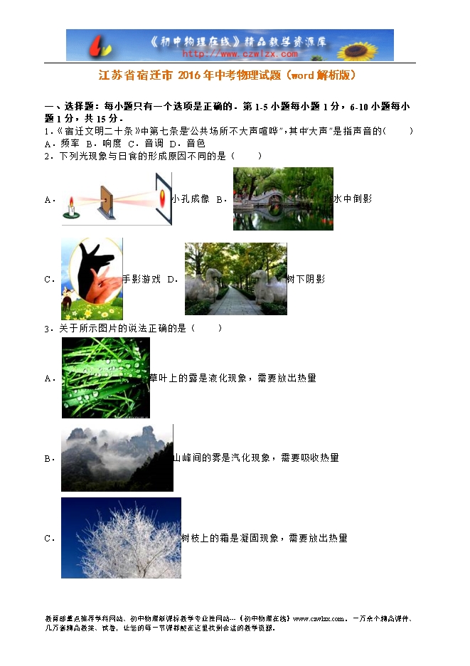 【内容简介】江苏省宿迁市2016年中考物理试题(word解析版)
