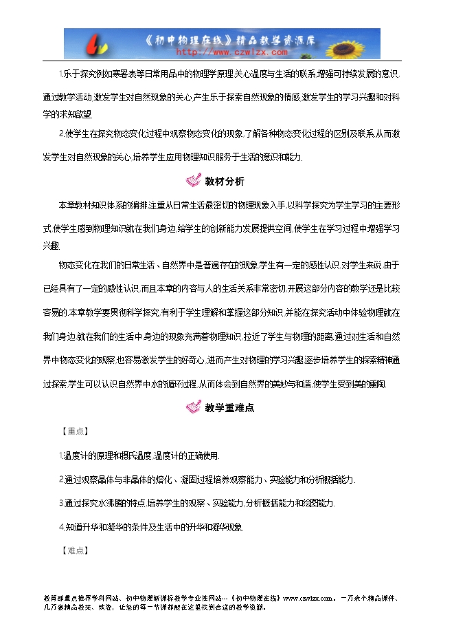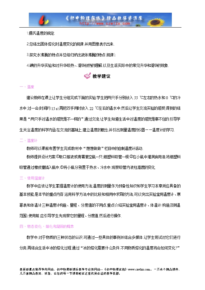 1.乐于探究例如寒暑表等日常用品中的物理学原理,关心温度与生活的联系,增强可持续发展的意识,通过教学活动,激发学生对自然现象的关心,产生乐于探索自然现象的情感,激发学生的学习兴趣和对科学的求知欲望.