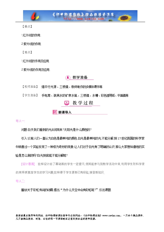 说明:也可通过播放与光的色散有关的自然现象的图片来引入课题.