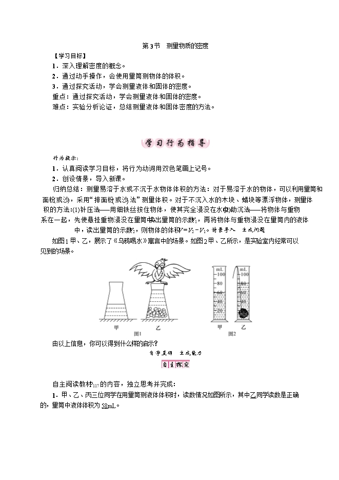 归纳总结:测量易溶于水或不沉于水物体体积的方法:对于易溶于水的物体,可以利用量筒和面粉(或沙),采用“排面粉(或沙)法”测量体积。对于不沉入水的木块、蜡块等漂浮物体,测量体积的方法:(1)针压法——用细铁丝按住物体,使其完全浸没在水中。(2)助沉法——将物体与重物系在一起,先使悬挂重物浸没在量筒中,读出量筒的示数V1,再将物体与重物浸没在量筒内的液体中,读出量筒的示数V2,则物体的体积V=V2-V1。情景导入 生成问题
