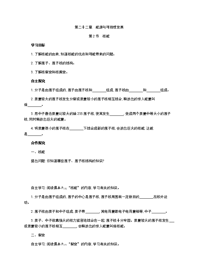 人教版九年级物理全册精品教学案:第二十二章能源与可持续发展第2节 核能(答案含解析)