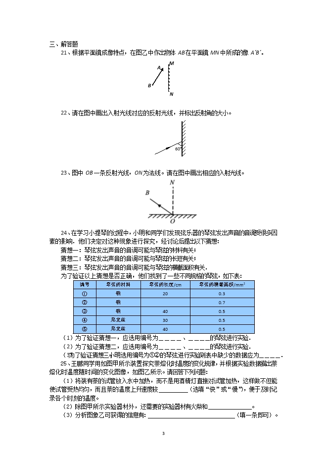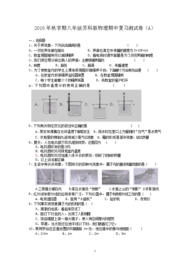 2016年秋学期苏科版八年级物理期中复习测试卷及参考答案(A)