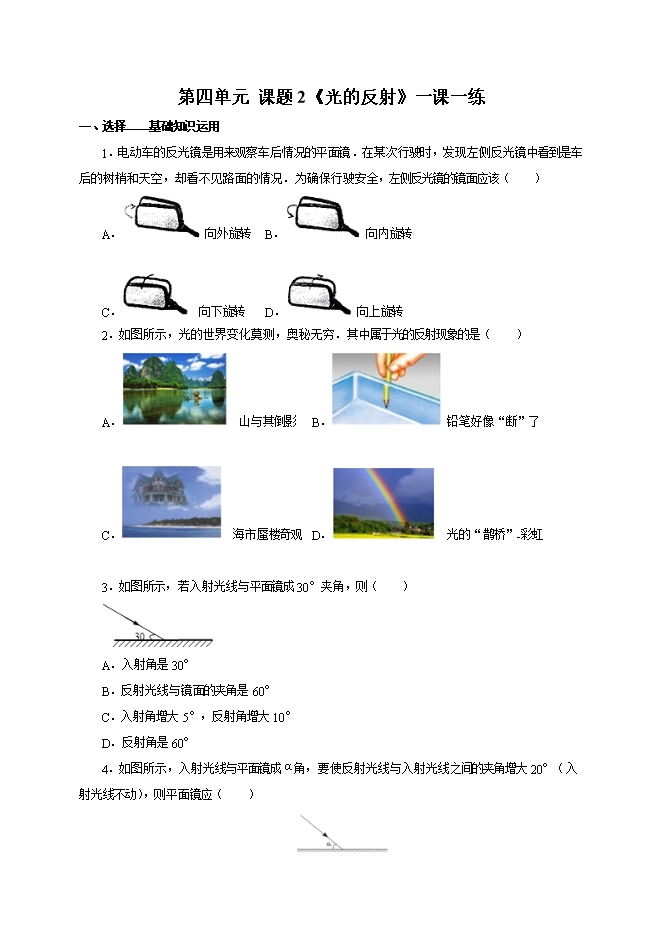 4.如图所示,入射光线与平面镜成α角,要使反射光线与入射光线之间的夹角增大20°(入射光线不动),则平面镜应( )