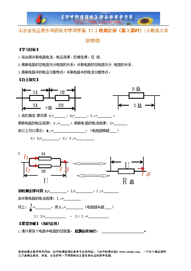 山东省安丘市东埠初级中学导学案:17.2欧姆定律(第2课时)(人教版九年级物理)
