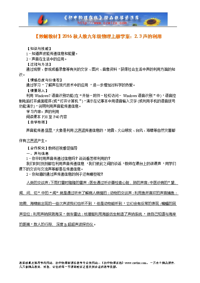【妙解教材】2016秋人教九年级物理上册学案:2.3声的利用