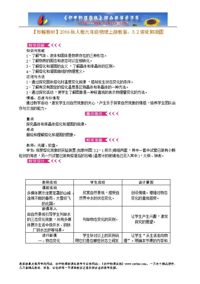 【妙解教材】2016秋人教九年级物理上册教案:3.2熔化和凝固