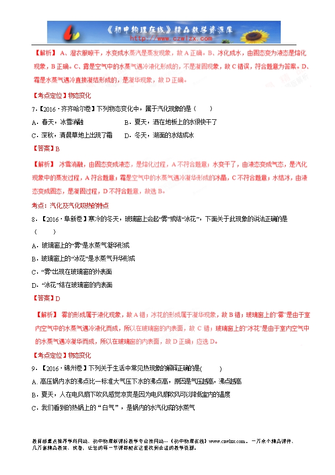 2.【2016?贺州卷】关于物态变化,下列说法正确的是( )