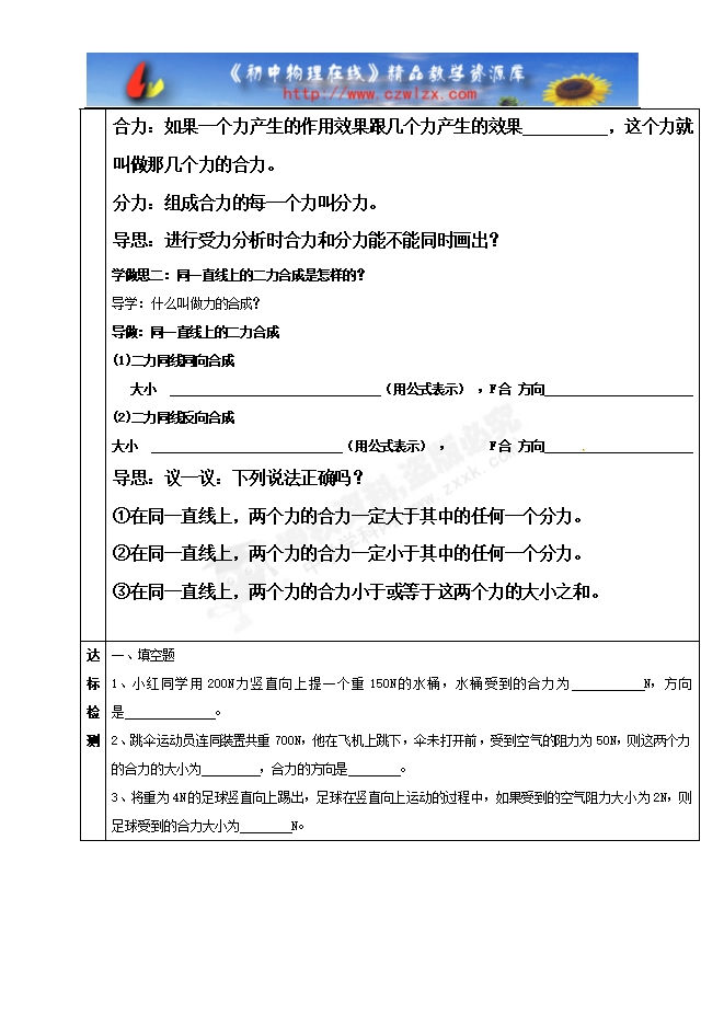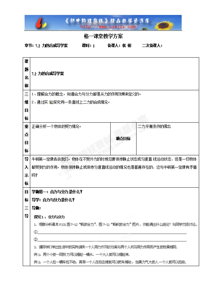 重庆市大学城第一中学校沪科版八年级物理全册教案:7.2力的合成
