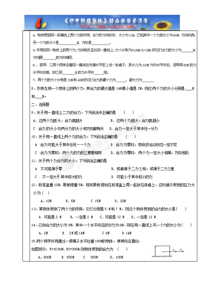 ②在同一直线上,两个力的合力一定小于其中的任何一个分力。