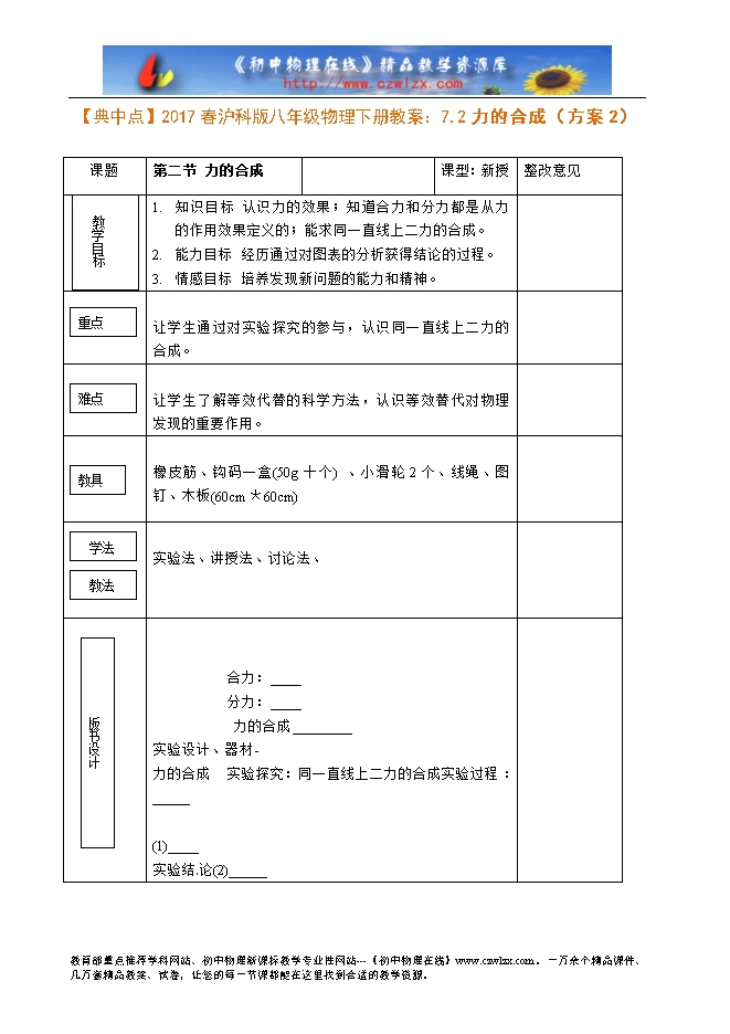 【典中点】2017春沪科版八年级物理下册教案:7.2力的合成(方案2)
