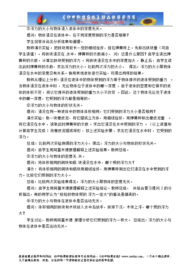 1.通过边学边实验,使学生知道什么是浮力,引导学生学会用“称重法”测浮力,并用实验“发现”阿基米德原理,探索浮力的大小与哪些因素有关。