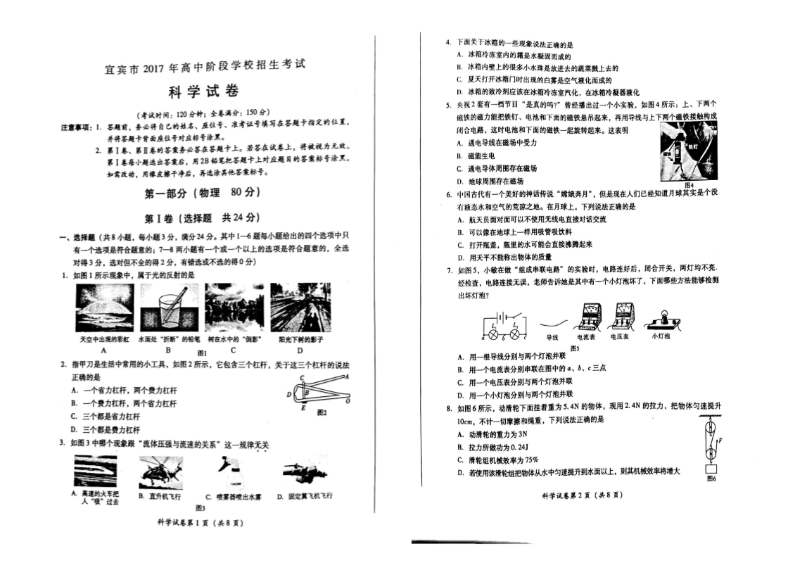【内容简介】2017年宜宾市高中阶段招生考试物理试卷(扫描版,无答案)