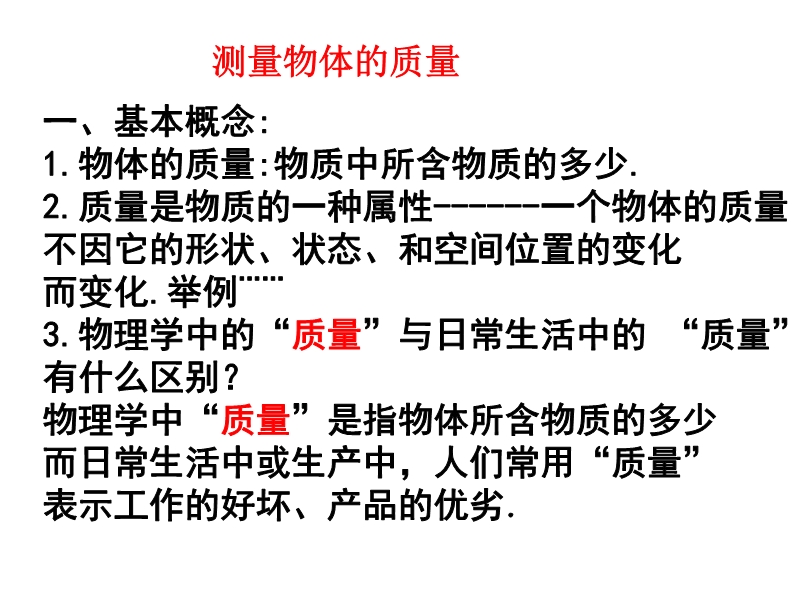 【内容简介】课件来自教学一线骨干教师根据新课标精神制作的《测量物体的质量》课件.