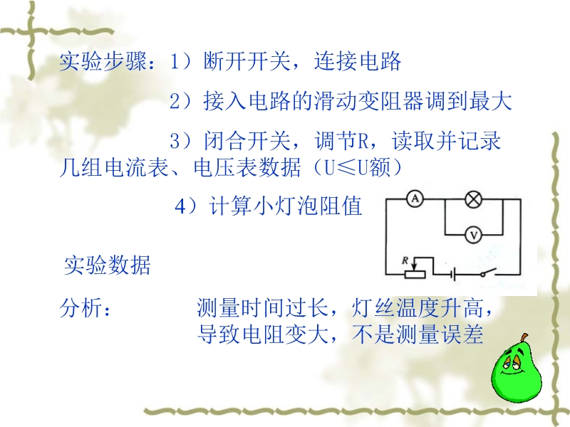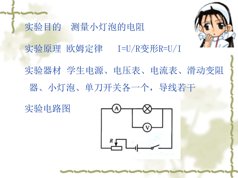 课件内容:人教版“测量小灯泡的电阻”实验全节课上课内容。