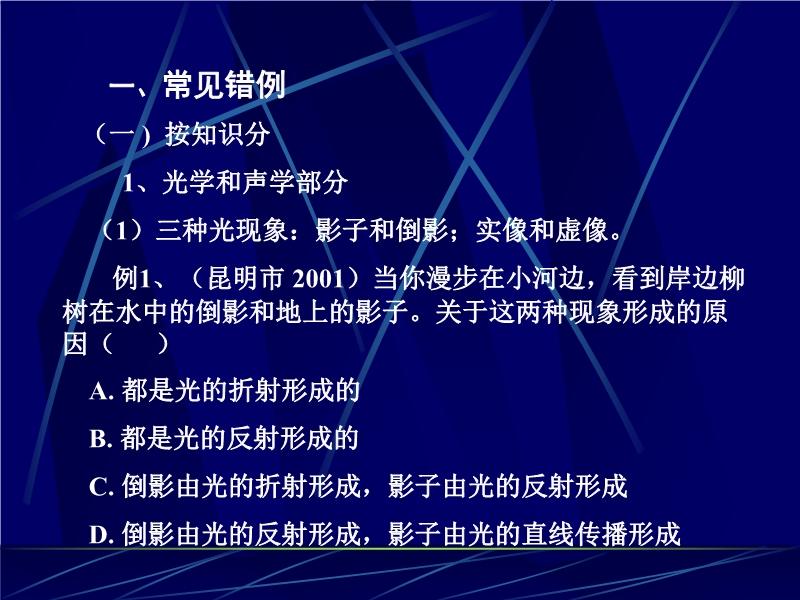 【内容简介】本课件是一个知识综合性的课件,共由76张幻灯片组成,可供初三总复习时使用,也可供单元复习时选用。本课件将整个初中物理学习过程中,学生易出现的错误分类进行汇总编写,并且写出了具体的原因分析。选择的题型具有典型性和代表性,题量丰富。本课件还解决了初中物理中的几个难点问题:受力分析、关于滑轮组的机械效率和电路问题,其中有例题分析,还精选了一定量的习题供参考使用。