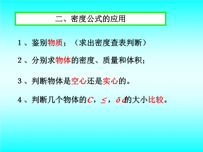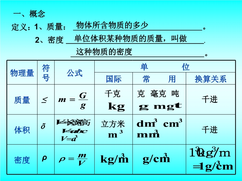 【内容简介】本课件以中考总复习为目的制作,共由13张幻灯片组成。本课件主要引导学生复习质量和密度的知识,教学设计主要分为三个部分:一是主要概念,引导学生总结了质量和密度的概念、单位、计算公式等;二是密度公式的应用,概括了密度公式的四个方面的应用,每个方面的应用都有具体的例题;三是怎样测液体的密度,将知识与实验相结合。本课件适合中考复习时使用,综合性强。