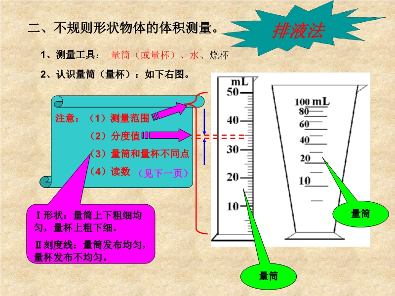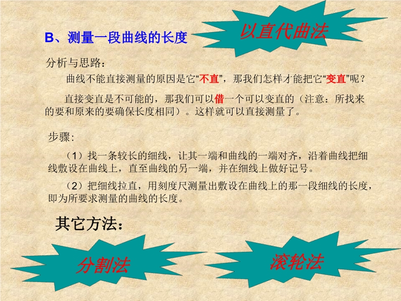 【内容简介】本课件以沪粤版新教材第一章第三节为基础制作,共有13张幻灯片。课件引导学生通过具体的测量活动认识了几种间接测量的方法,如累积法、以直代曲法、分割法、滚轮法等,课件还引导学生学习了量筒和量杯的使用方法,并用具体的事例引导学生探究如何用量筒测量不规则固体的体积,最后引导学生讨论了如何估测长度和时间。课件制作生动、内容具体,重点突出。