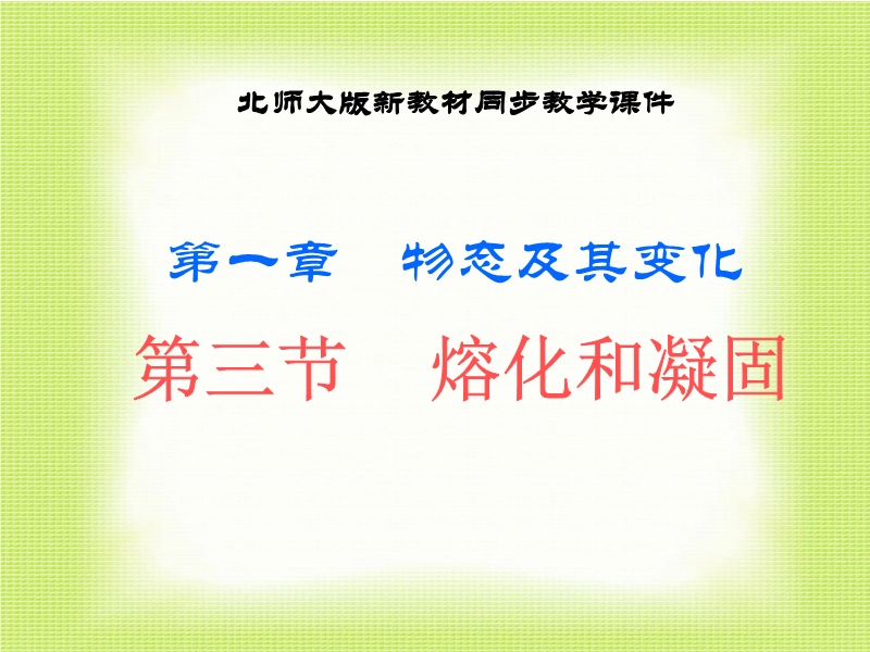 【内容简介】本课件以北师大版新教材第一章第2节为基础制作,共有18张幻灯片,插入了4个flash动画和一个视频文件。主要引导学生学习了熔化和凝固的概念,课件通过flash动画展示了晶体和非晶体的熔化特点及晶体和非晶体的凝固特点等,现象明显,效果较好,具有很好的交互性。课件中有巩固练习,可供教学“熔化和凝固”时参考使用。