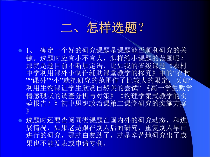【内容简介】《课题研究专题讲座》ppt课件是在课题研究会上专题讲座,就课题研究的有关问题进行了较全面的论述,对初涉教学课题研究的人有一定的指导作用。