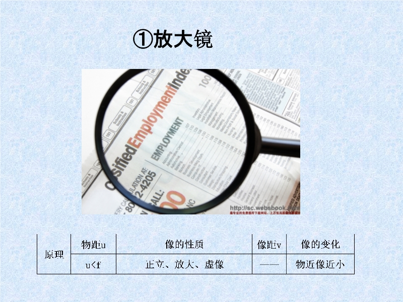 【内容简介】本课件以沪科版新教材第四章第七节为基础制作,共有14张幻灯片。本课件主要引导学生认识了凸透镜成像的应用,向学生展示了放大镜的应用及原理,展示了显微镜的基本结构及成像原理,展示了望远镜的基本结构及成像原理,展示了照相机和投影仪的基本结构及原理等。课件制作新颖,图片清晰,教学重点突出。