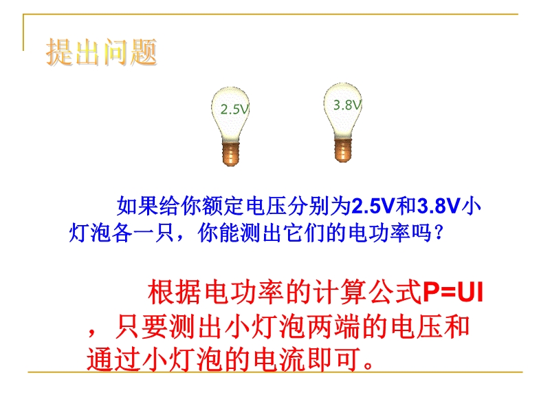【内容简介】课件以沪科版新教材第十五章第三节为基础制作,共有26张幻灯片,插入了一个视频文件 和一个flash动画。主要引导学生通过实验探究了测量电功率的方法、原理、实验过程等,课件引导学生明确了实验原理、设计了实验电路图、明确了怎样选择实验器材、如何进行实验,如何进行分析论证等探究过程。课件还引导学生讨论了如何用家用电能表测量家用电器的电功率,向学生展示了家用电能表。