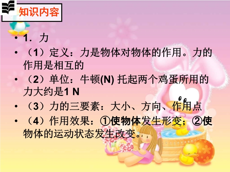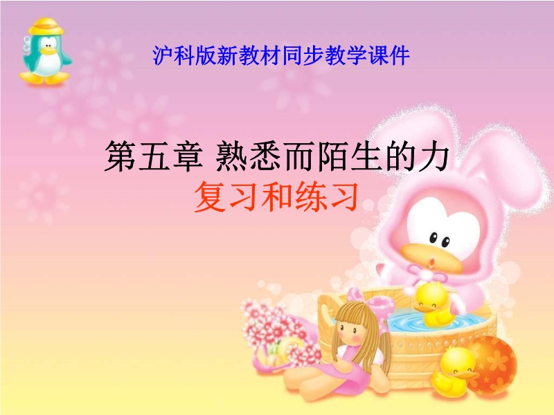 【内容简介】本课件以沪科版新教材第六章为基础制作,共有34张幻灯片。主要引导学生复习了力的概念、力的三要素、力的作用效果、力的示意图、弹力的概念、弹簧测力计的原理及使用方法、重力的概念方向及意义、重力与质量的关系、有关摩擦的知识等。课件精选了大量的例题和习题,主要以练习为主,提高学生分析问题和解决问题的能力,发展学生的智能。