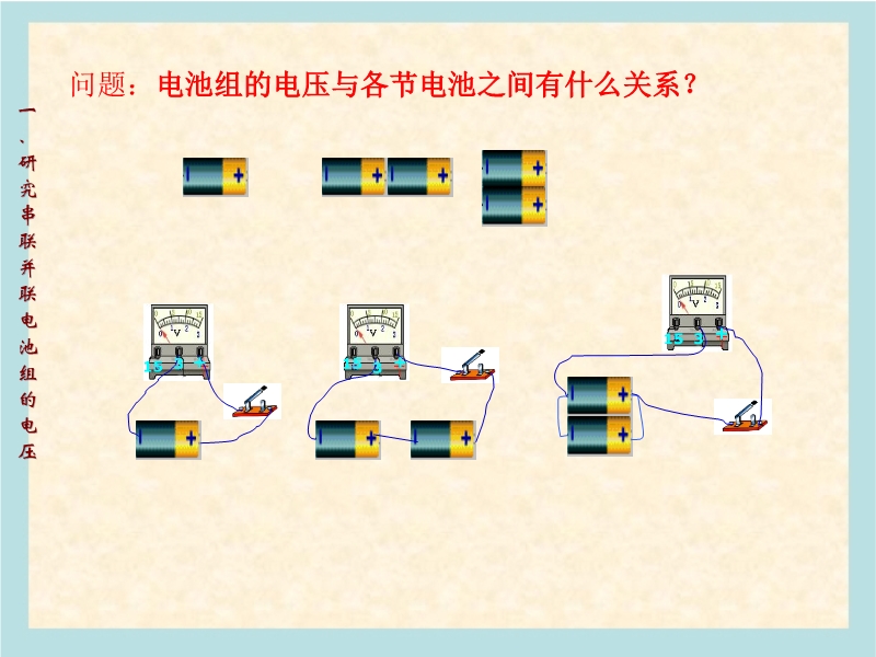 【内容简介】本课件以人教版新教材第六章第二节为基础制作,共有16张幻灯片,并插入了一个flash动画。课件主要引导学生探究了串联和并联电池组的电压特点、串联电路总电压与各电压之间的关系、并联电路各电压之间的关系等。教学设计以学生探究实验 为主,让学生自主地进行探究式的学习。