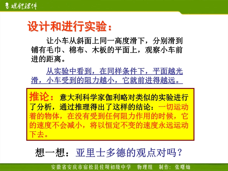 【内容简介】本课件以人教版新教材第十二章第五节为基础制作,共有18张幻灯片和1个flash支持。课件通过flash动画来研究阻力对运动的影响,从而推导出牛顿第一定律。课件的优点动态图片gif格式运用为课件增色不少!