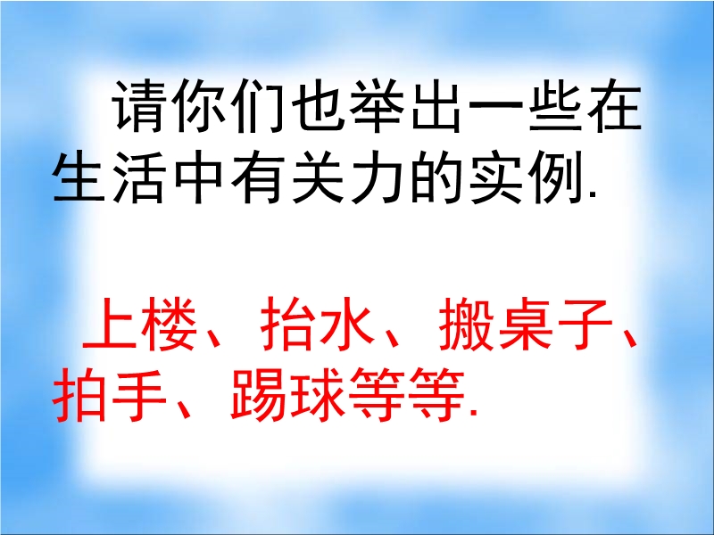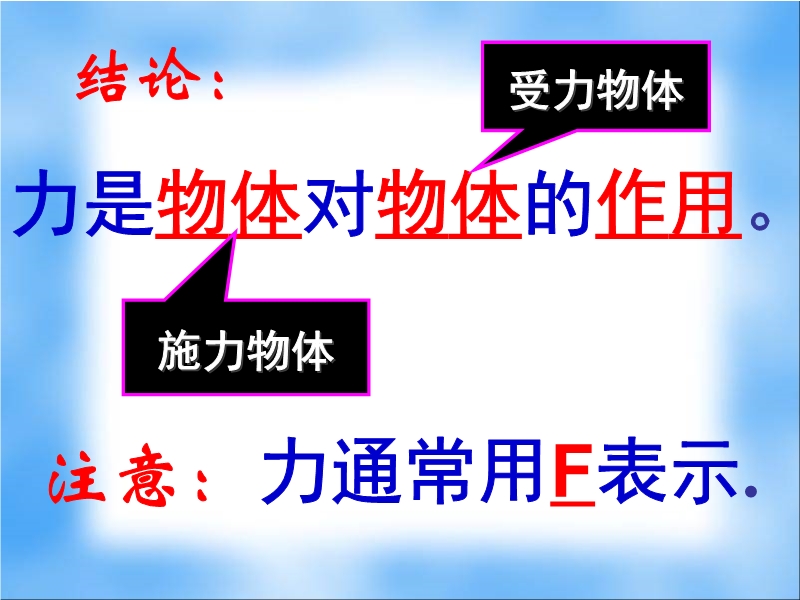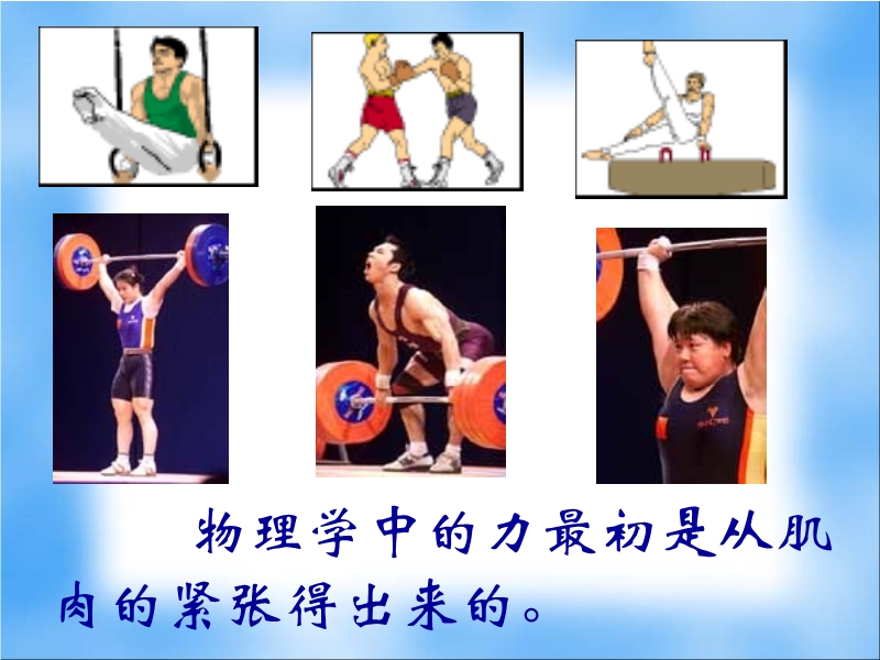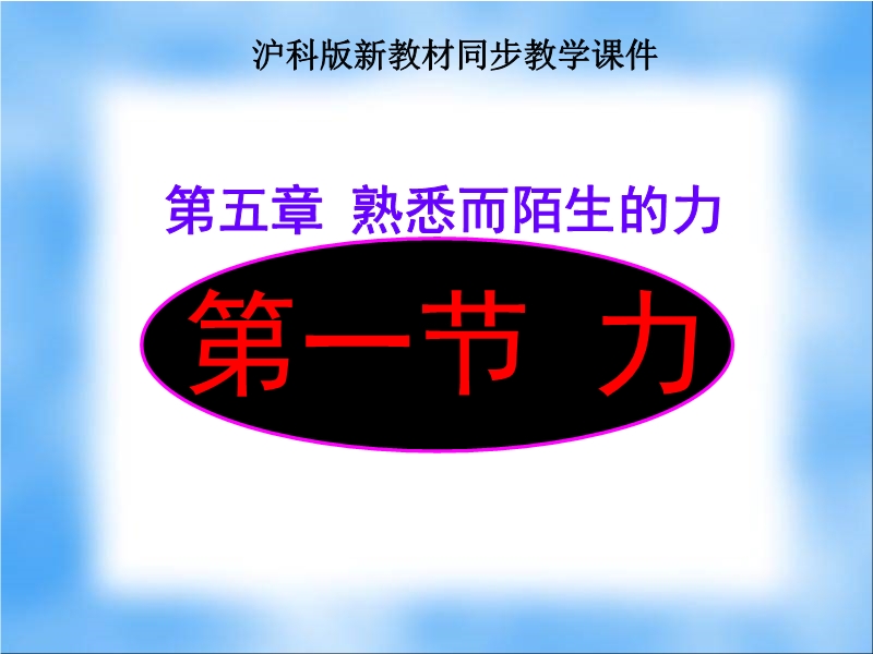 【内容简介】本课件以沪科版新教材第五章第二节为基础制作,共有18张幻灯片。课件引导学生通过具体的小实验探究了力的作用效果与力的大小 、方向、作用点有关,归纳了力的三要素,认识了力的单位,课件还引导学生学习 了力的示意图的画法等,课件中精选了典型的习题,供课堂教学参考使用。
