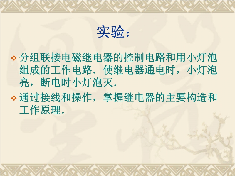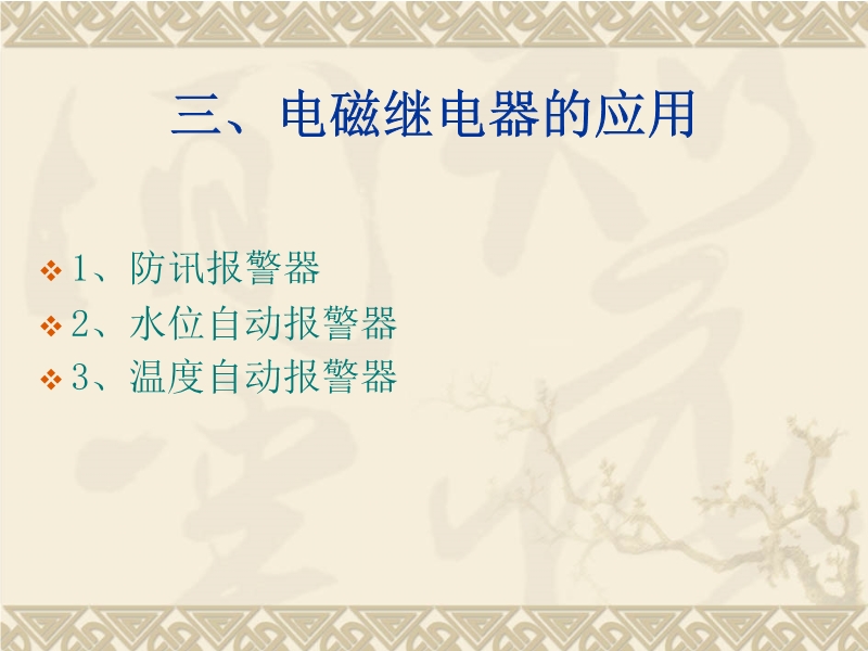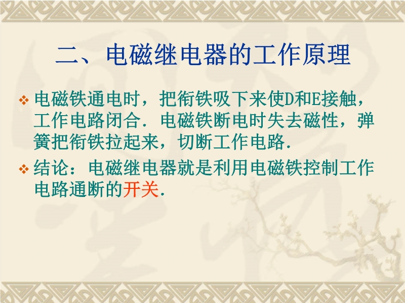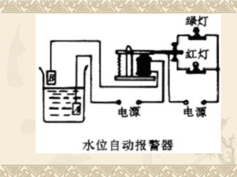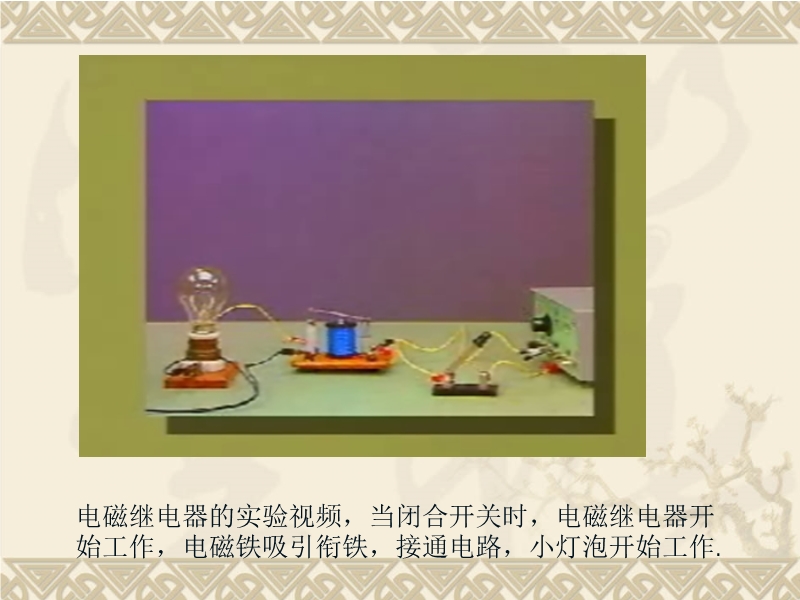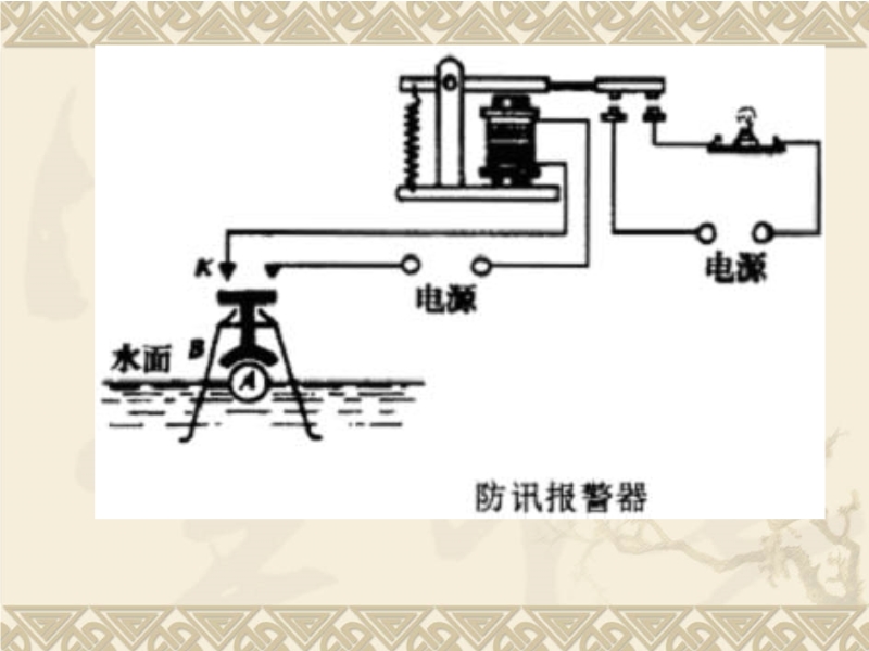 【内容简介】本课件以教科版九年级新教材第八章第二节为基础制作,共有12张幻灯片。课件展示了电磁继电器的基本构造和工作电路,引导学生讨论了电磁继电器的工作原理,并引导学生通过一个小实验学习了电磁继电器的使用,更有利于学生对电磁继电器的工作原理的理解,课件还展示了电磁继电器在生活中的重要应用,如防汛报警器、温度自动报警器、水位报警器等。本课件可供教学“电磁继电器及自动控制”时参考使用。