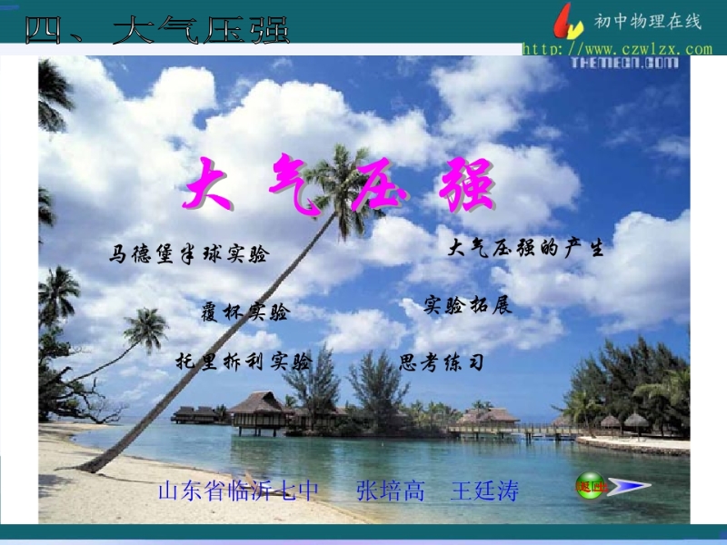 【内容简介】本课件以沪科版教材第八章为基础制作,共有30张幻灯片, 主要引导学生复习巩固本章内容,课件借鉴了网站上的flash课件综合而成,精选了2010年涉及本章知识点的中考试题能培养学生分析问题和解决问题的能力,发展学生的智力,开发学生的思维等。