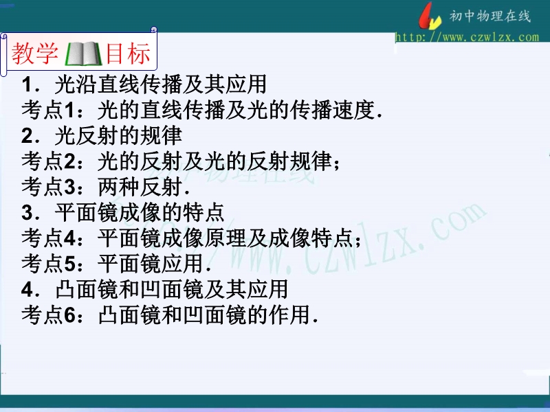 【内容简介】课件共36张幻灯片,课件按如下考点组织学生复习:考点1:光的直线传播及光的传播速度.考点2:光的反射及光的反射规律;考点3:两种反射.考点4:平面镜成像原理及成像特点;考点5:平面镜应用.考点6:凸面镜和凹面镜的作用. 同时分析了中考走向和对2011年中考进行了展望。
