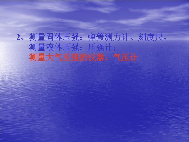 【内容简介】本课件以沪科版新教材第八章第三节为基础制作,共有17张幻灯片。课件引导学生通过观察生活中的实例认识了大气压强的存在,讨论了如何测量大气压强的大小,展示了常见的气压计,讨论了大气压强的变化可能与哪些因素有关等。课件还精选了适量的课堂习题,可供教学“大气压强”时参考使用。