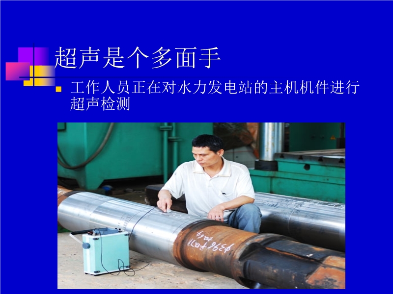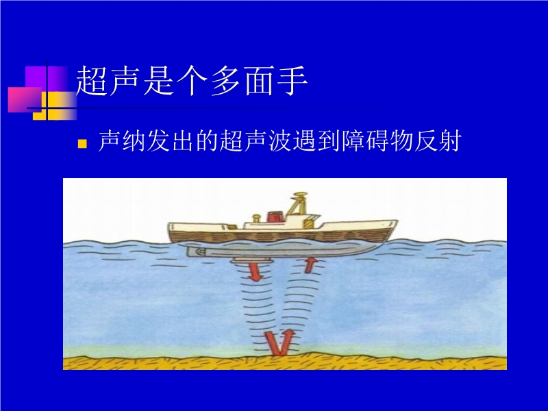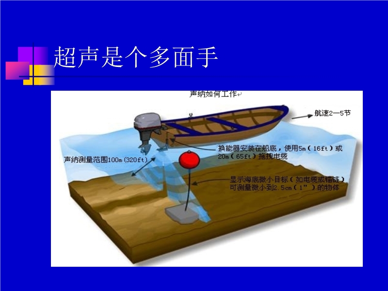 本课件以教科版新教材八年级上第三章第五节为基础制作,共有19张幻灯片。课件向学生展示了声学领域中的各方面的应用。