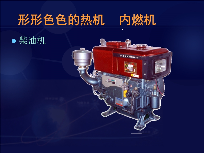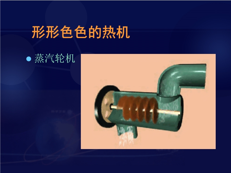 本课件以教科版新教材九年极上册第二章第一节为基础 制作 ,共有13张幻灯片,课件使学看到了瓦特设计的蒸汽机的模型,引导学生认识了热机的工作原理及能量是如何转化为机械能的,并了解了热机的分类。