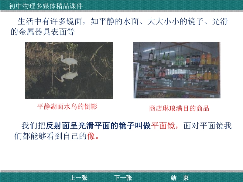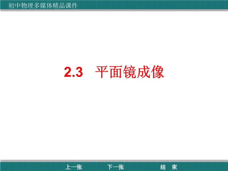 【内容简介】本课件以人教版新教材第二章第二节为基础制作,共有13张幻灯片,并插入了2个flash动画。课件用flash动画进行了模拟演示平面镜成像实验,并总结归纳了成像的特点,课件提供了另一个flash动画用以演示成像的原理,课件设计思路清晰,合理。