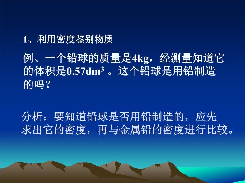 【内容简介】本课件以人教版新教材第十一章第五节为基础制作,共有23张幻灯片。主要引导学生应用密度知识解决或解释生活中的问题和现象,知识的内容为:1、利用密度鉴别物质;2、商业中鉴别牛奶的浓度、酒的浓度,农业生产中配制盐水选种的问题3、根据密度知识选择不同的材料。课件中有例题和巩固练习 ,可供教学“密度的应用”时参考使用。