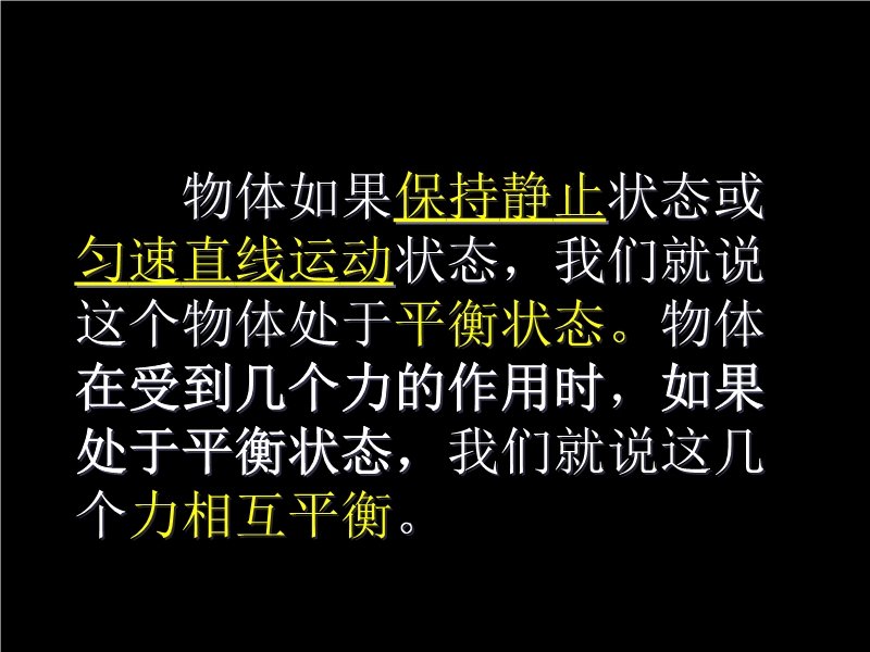 【内容简介】本课件以人教版教材第十二章第六节为基础制作,共有25张幻灯片。课件引导学生认识了什么是平衡状态,探究了物体处于平衡状态的条件,即二力平衡的条件。课件用flash动画模拟探究了二力平衡状态的条件等。课件制作新颖,有反馈练习,值得借鉴。