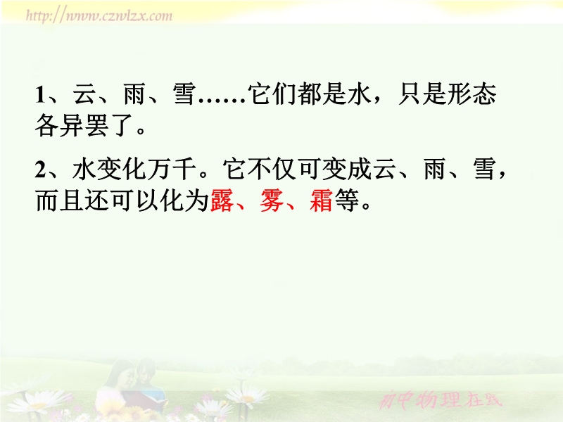 【内容简介】本课件以沪科版新教材第十一章第一节为基础制作,共有19张幻灯片,并插入了两个flash动画和3个视频文件。课件主要引导学生通过视频和flash动画等认识了自然界中的水循环过程及在常见状态的形成过程,探究了晶体熔化的特点和液体沸腾的特点。