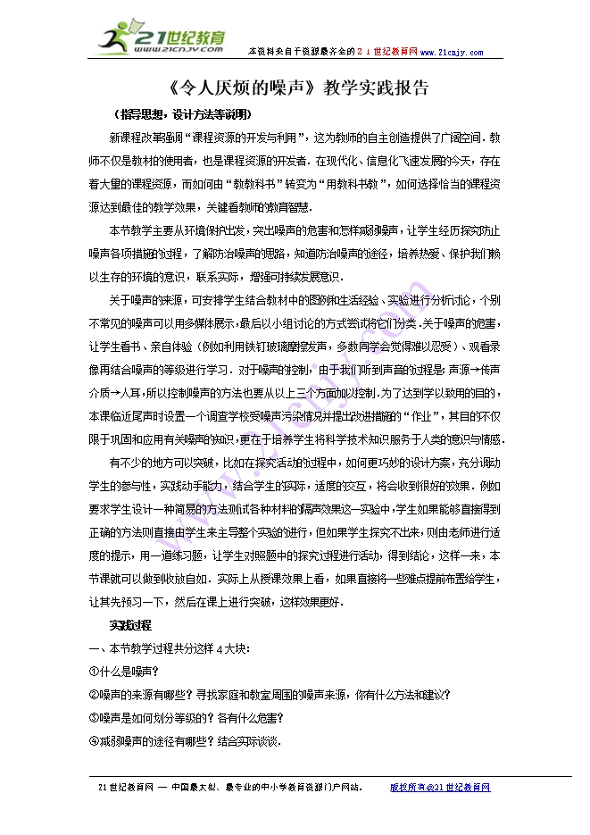 【内容简介】本课件以苏科版新教材第一章第三节为基础制作,共有10张幻灯片,内附教案、设计方案。课件引导学生认识了乐音和噪声,分析了噪声的来源,讨论了噪声的危害,课件展示了控制噪声的三个途径,并展示了具体的措施。课件制作较新颖,生动,图片清晰。