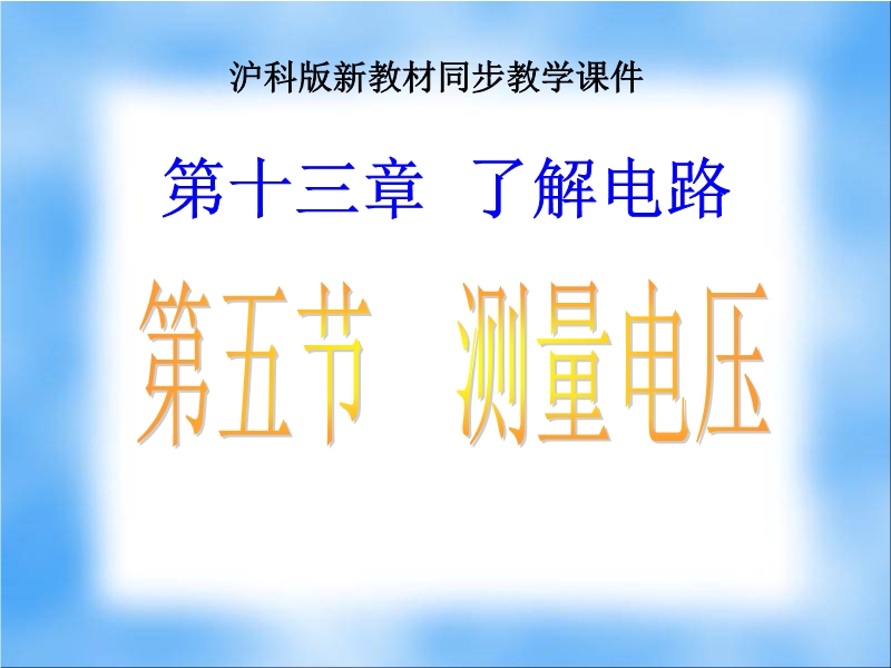 【内容简介】本课件以沪科版新教材第十三章第五节为基础制作,共有17张幻灯片。课件引导学生讨论了电压的作用,学习了电压的单位,展示了电压表,让学生认识了电压表。课件还引导学生用电压表测量了电池的电压、串联电路的电压、并联电路的电压,并探究了它们的规律等。本课件可供教学“电压及电压表”时参考使用。