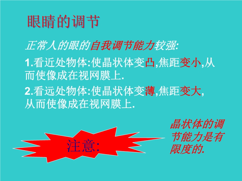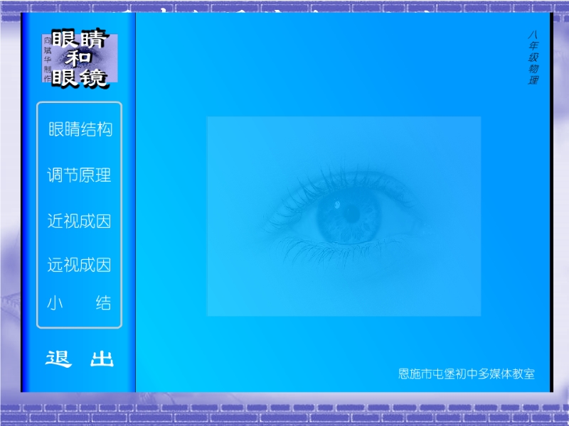 【内容简介】本课件以沪科版新教材第四章第六节为基础制作,共有27张幻灯片,并插入了一个flash动画。课件首先引导学生认识了人眼的构造,然后用flash动画模拟了人眼的调节过程、视觉的形成过程、近视眼和远视眼的形成,讨论了近视眼和远视眼的矫正方法,课件还引导学生认识了如何保护眼睛,展示了简单的眼保健操等。本课件可供教学“眼睛”时参考使用。