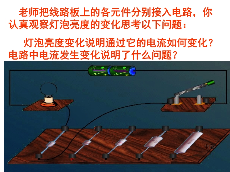 【内容简介】本课件以沪科版新教材第十四章第一节为基础制作,共有29张幻灯片,并插入了3个flash动画。课件首先引导学生观察一个小实验,让学生认识了由于电阻变化引起的灯泡亮度变化及电流变化,从而引导学生认识了电阻的意义,并引导学生探究了决定电阻的因素有哪些,并用flash动画模拟了这个实验。课件制作较形象、生动,教学内容具体。本课件可供教学“电阻变阻器”时参考使用。