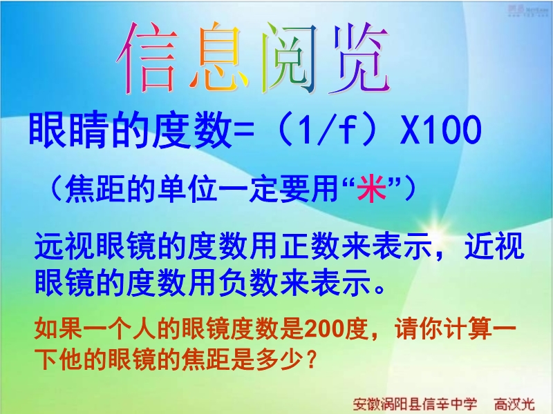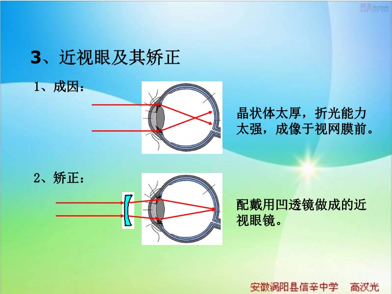 【内容简介】本课件以沪粤版新教材为基础制作,共有46张幻灯片,并插入了8个flash动画。内嵌flash动画详细演示了眼睛构造、调节原理、近视眼和远视眼的成因及矫正方法等,较详细、具体、生动。
