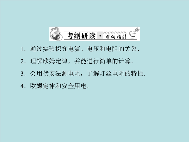 【内容简介】中考复习《第四单元 电与电能 》第3课时ppt课件,本课件以中考物理总复习第一轮复习为目的制作,共有33张幻灯片。课件主要引导学生复习了欧姆定律、伏安法测电阻、欧姆定律的应用、安全用电等。复习过程主要为分以下几个模块:考纲研读、基础梳理、考点攻略、中考题精选等。课件中有例题和习题,例题有详细的分析过程。本课件可供复习“欧姆定律及其应用”时参考使用。