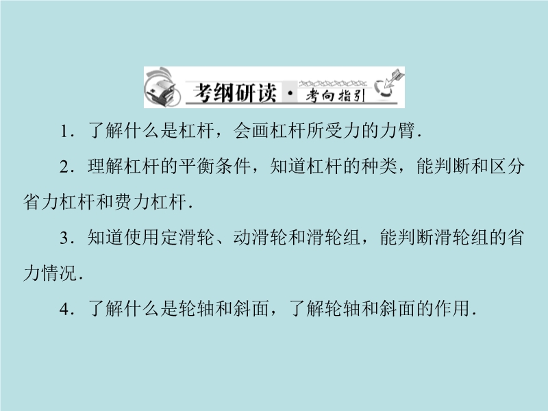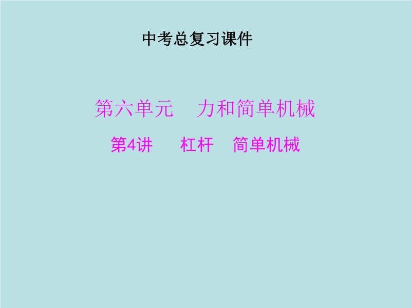 【内容简介】中考复习《第六单元 力和简单机械》第4课时ppt课件,本课件以中考物理总复习第一轮复习为目的制作,共有25张幻灯片。复习内容主要有杠杆的概念、杠杆的五要素、杠杆的平衡条件、杠杆的分类、动滑轮和定滑轮的特点、滑轮组的特点、轮轴和斜面的作用等。复习过程主要为分以下几个模块:考纲研读、基础梳理、考点攻略、中考题精选等。课件中有例题和习题,例题有详细的分析过程。本课件可供复习“简单机械”时参考使用。
