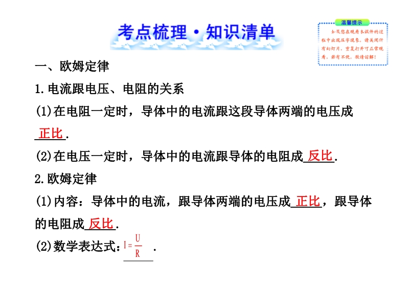 【内容简介】2013年中考复习课件:人教版《欧姆定律》ppt课件 根据人教版《欧姆定律》一章内容制作,课件共103幻灯片,课件分成三个板块组织学生复习,考点梳理,梳理了本章的主要知识点:探究欧姆定律、欧姆定律的运用、动态电路等,核心要点复习中考常考考点和必考考点,实验专项引导学生复习本节实验:探究电流与电压、电阻的关系,课件有知识的总结,重在对学生的能力的提高,精选了部分11和12年中考试题。